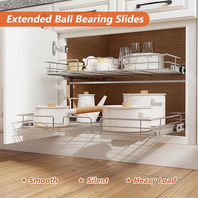 - 【Sturdy & Smooth Slide-out Drawer】 This pull out drawers for kitchen cabinets manufactured with a ball bearing system that slides out very smooth,heavy and sturdy. It conveniently slides out so you don’t have to dig way back in the cabinet when you are looking for what you need! So ROOMTEC cabinet pull out shelves serves your needs for your kitchen, Bathroom, laundry and pantry storage organizing.