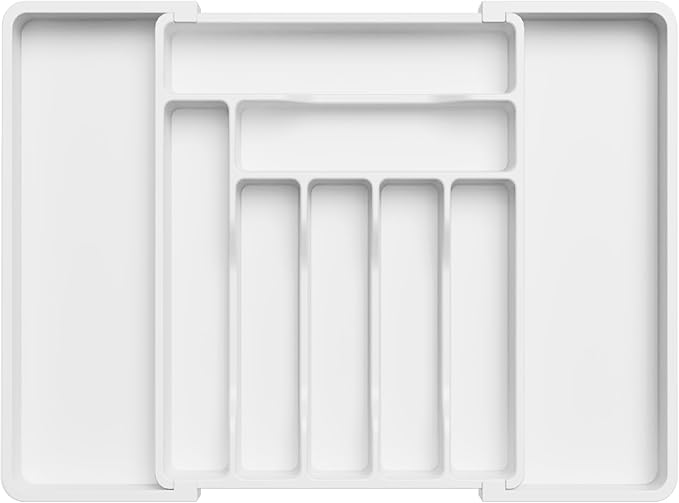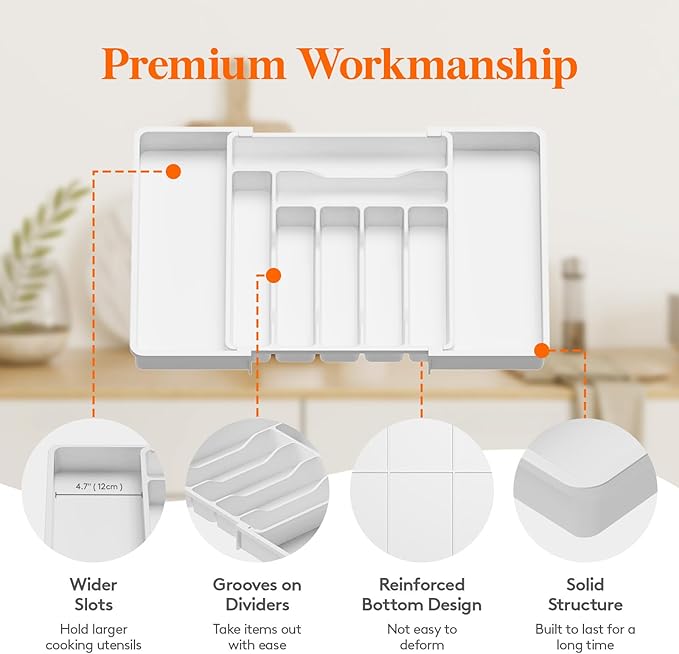 - Premium Construction: The utensil organizer for kitchen drawers is made of BPA-free PP material, ensuring its safety with all types of utensils, silverware and flatware. It has a solid bottom panel with sturdy dividers, keeping your silverware in place.