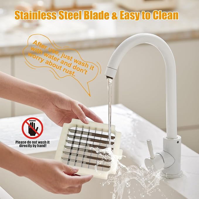 - 【Food Grade Stainless Steel Blades】: The potato slicer blades are made of food grade SUS304 stainless steel, including two blades (1/2 inch and 3/8 inch). Durable, easy to clean, not easy to rust; the body is made of aluminium alloy material, beautiful appearance, high-end atmosphere, oil and dirt resistant. Note: Don't touch the blades directly with your hands during the cleaning process to avoid cuts.