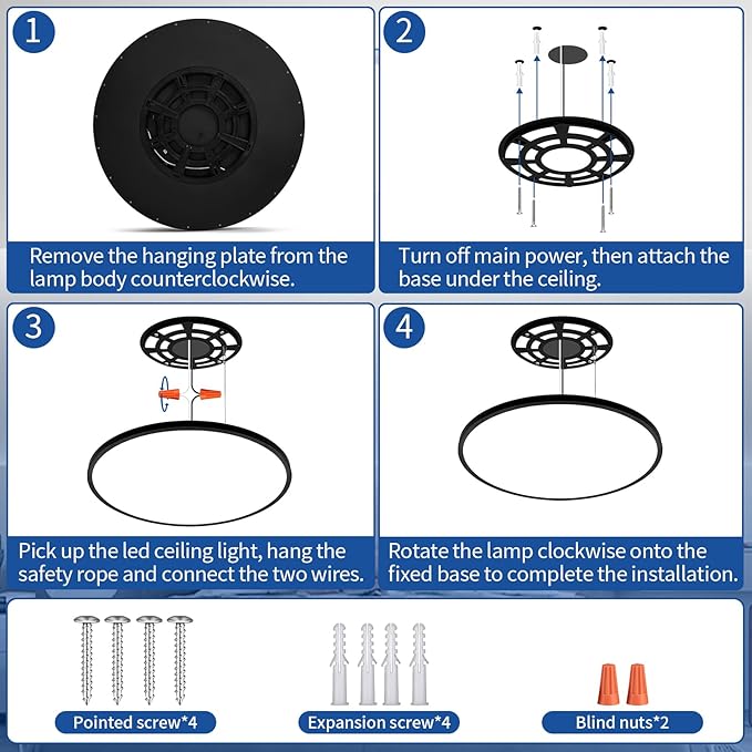 - Easy Installation: Only 3 easy steps to install the flush mount ceiling light. β Turn off main power, then attach the base under the ceiling.(This ceiling light is large, itβs not suitable to be directly fixed on the wiring box base.,It's needs to be fixed directly on the ceiling for safety, Please check in advance whether it is suitable for installation) β‘ Pick up the led ceiling light, and connect the two wires. β’ Rotate the ceiling light to the mounting base. Simple and safe. The installation of the led ceiling lamp can be done in a few minutes. (All accessories needed and instructions are included in the package)