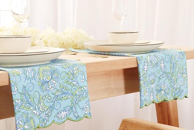 PurpleEssences Scalloped Embroidery Kalamkari Cloth Napkins Christmas Holiday Winter Table Decor 100% Cotton Set of 4-18 x 18 inch - Light Blue Edges - Sage Green
