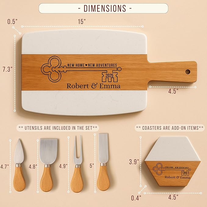 - Personalized Christmas Gift Idea : Add a custom engraving to make this cheese board and coaster set a truly unique Christmas gift. Perfect for newlyweds, couples, moms, or friends celebrating their first holiday in a new home.