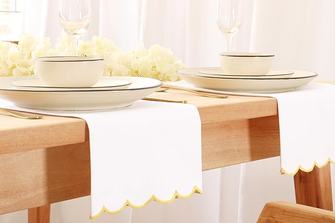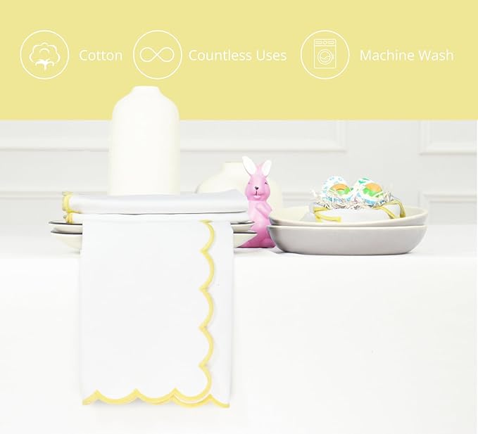 PurpleEssences Scalloped Embroidery Cloth Napkins Christmas Holiday Winter Table Decor 100% Cotton Set of 4-18 x 18 inch - White - Edges - Yellow