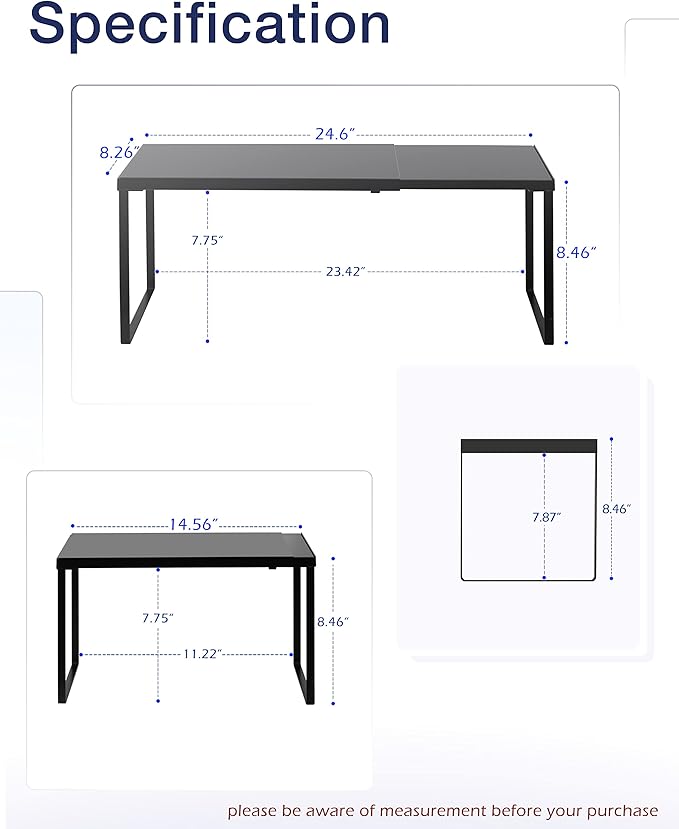 - SPECIFICATION: 8.26’’D * 14.56-24.6’’W * 8.46’’H. If you purchase 2 of these expandable shelves set you can stack one of top of another thereby creating a two-tier storage space. Easy to assemble with a clear manual.