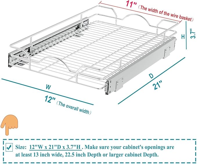 - The Size of Cabinet Pull Out Shelves:12"W x 21"D x 3.7"H. This sliding cabinet organizer needs at least 13 inch wide and larger cabinet openings. Min cabinet interior depth: 22.5 inch.