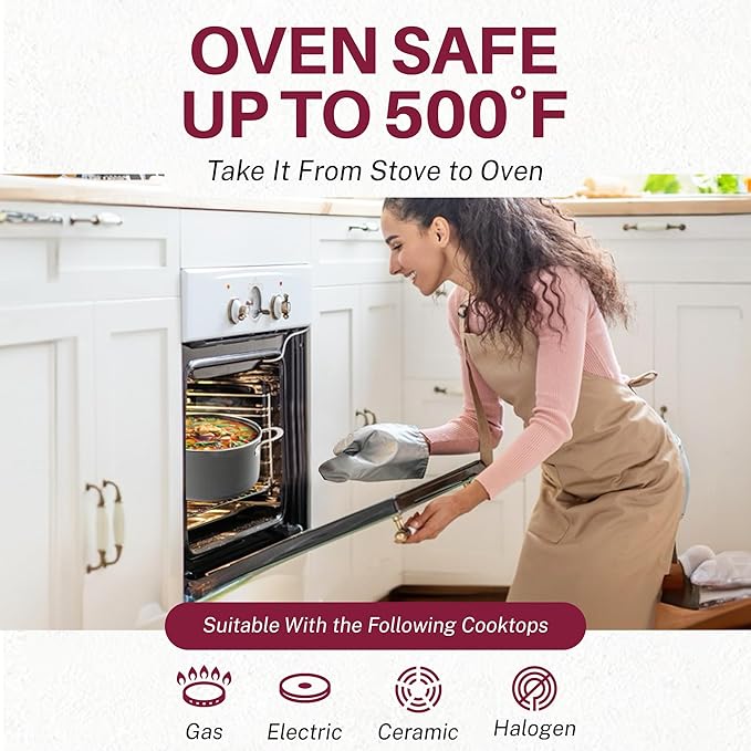 - COOKTOP & OVEN SAFE - Compatible with gas, electric, glass cooktops & oven safe up to a sizzling up to 500Β° Fahrenheit, lids included! Please note, this set isnβt compatible with induction cooktops