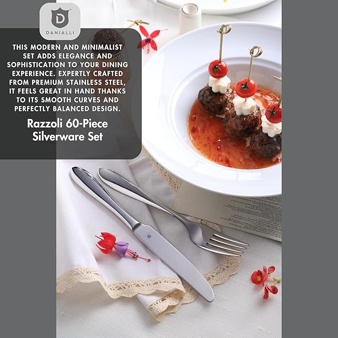 Modern Silverware Set, 18/10 Stainless Steel Flatware, Mirror Finish, Dishwasher Safe, Elegant Cutlery for Home and Dining, Built to Last (60-Piece, Razzoli)