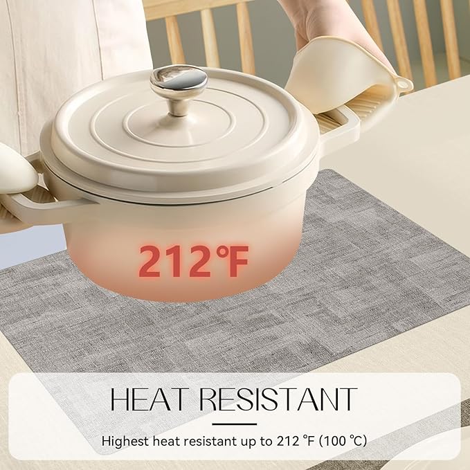 - HEAT-RESISTANT: Both sides are made of long-lasting and heat -resistant faux leather. the thickened placemats (0.12 inch/ 0.3 cm) ensure the heat won’t transfer to your cherish table. Highest heat-resistant can amount to 212 °F (100 °C), from leaving a white heat mark.
