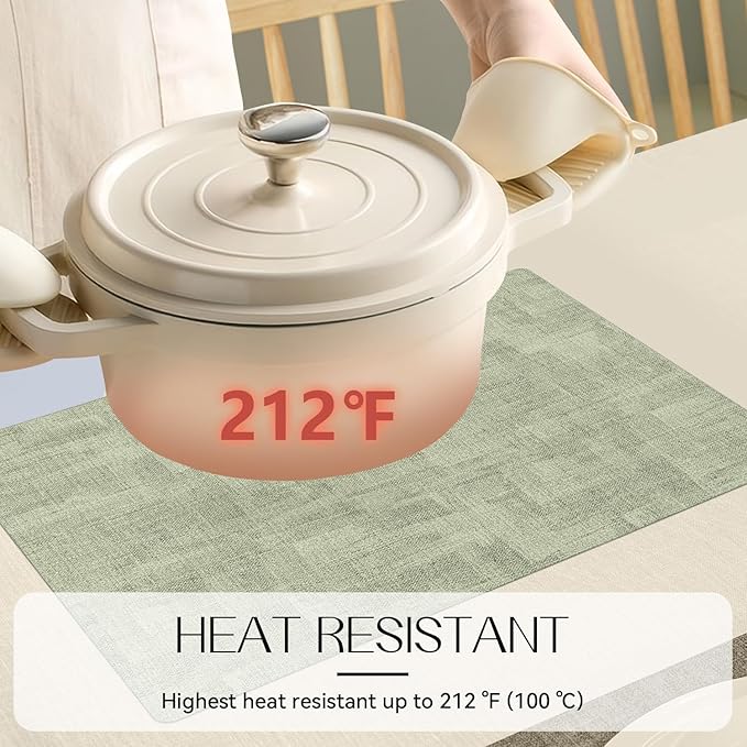 - HEAT-RESISTANT: Both sides are made of long-lasting and heat -resistant faux leather. the thickened placemats (0.12 inch/ 0.3 cm) ensure the heat won’t transfer to your cherish table. Highest heat-resistant can amount to 212 °F (100 °C), from leaving a white heat mark.