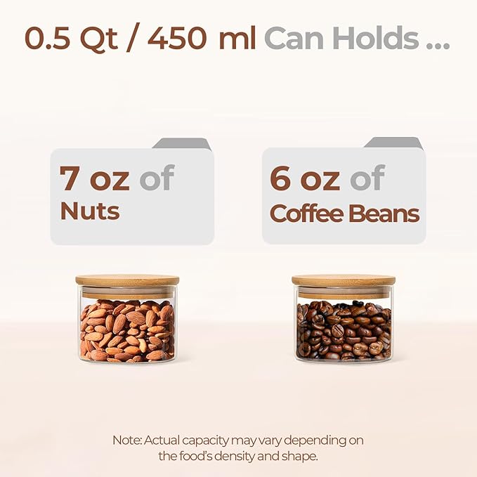 - Versatile Glass Canisters: The food storage jars are suitable for storing various ingredients, snacks or cookie, tea, candies, coffee bean, dried fruits, nuts and spices; you can aslo use the small glass jars as meal prep jars or salad jars