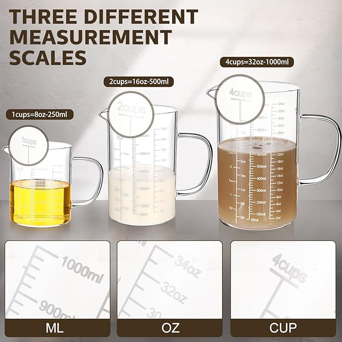 - Multi Capacity Choice: glass measuring cups set contains glass cups in 3 different capacities, which are approx. 1000 ml/ 32 oz/ 4 cup, 500 ml/ 16 oz/ 2 cup, and 250 ml/ 8 oz/ 1 cup; These multi capacity combinations can meet the needs of various food preparation in the kitchen, making your baking easier, more convenient and more pleasant