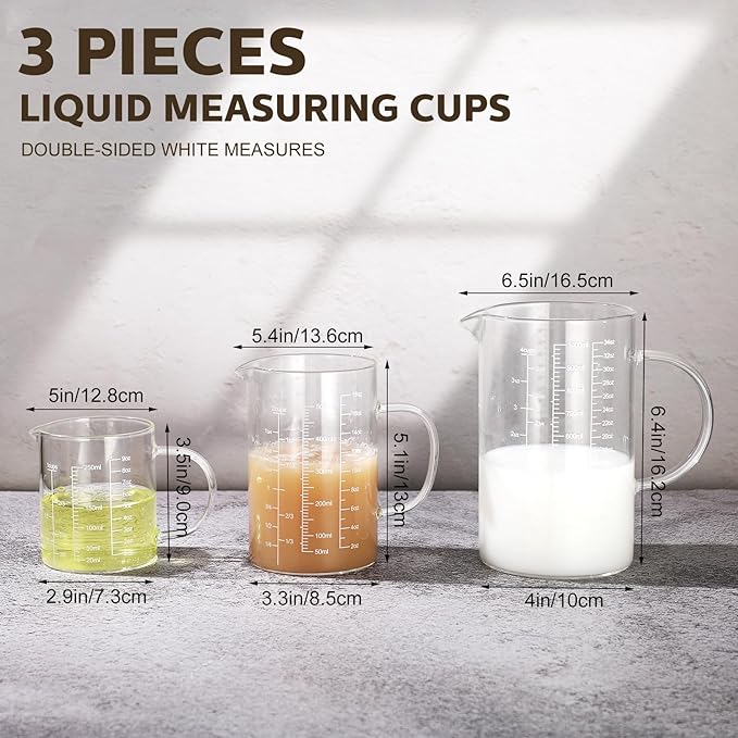 - Package Content: the package includes 3 clear liquid measuring cups to measure dry objects and liquids, which can be applied to create balanced recipes, make craft cocktails, separate liquids, heat milk, stir batter, make juice drinks, etc., ideal for kitchen cooking and food preparation