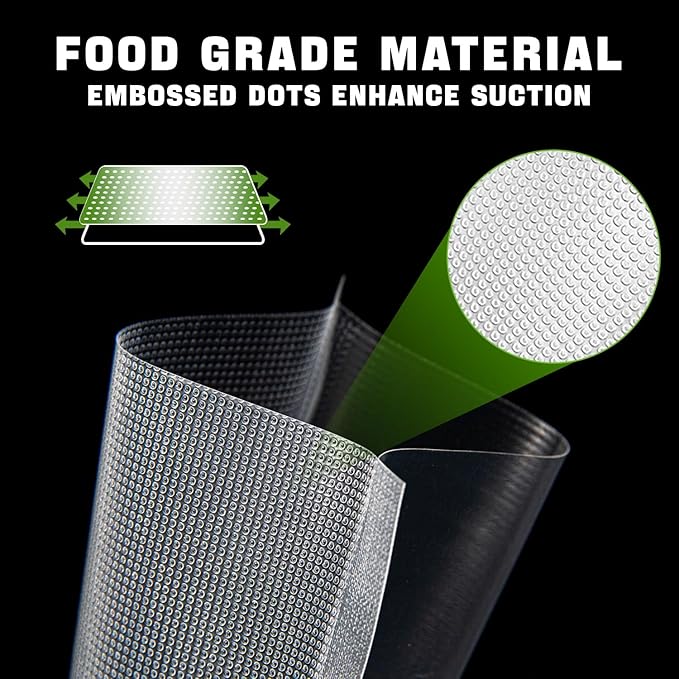 - Heavy Duty and Puncture Prevention:food saver bags made of the highest quality 7-layer material, heavy-duty to prevent punctures and retain freshness, resistant to punctures and tears during storage, with an embossed dot surface for increased suction for maximum freshness.