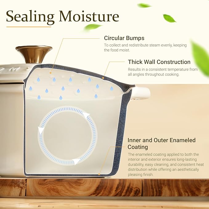 - Effortless Cleaning & Safety First: The flat and smooth enamel surface not only delivers a superior cooking experience but also makes cleaning a breeze. Easily remove food residues with a gentle wipe from a soft sponge or cloth. Additionally, we've included a cotton heat-resistant cap, ensuring a comfortable grip and safeguarding you from burns when handling the pot's handles and lid.