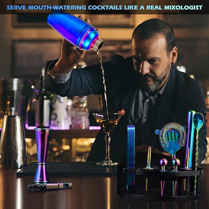 Bartender Kit with Stand, 12-Piece Bar Set | 24oz Cocktail Shaker Set for Drink Mixing, Martini Shaker Set with Bar Tools, Recipes Booklet | Fun Housewarming Gift (Rainbow)