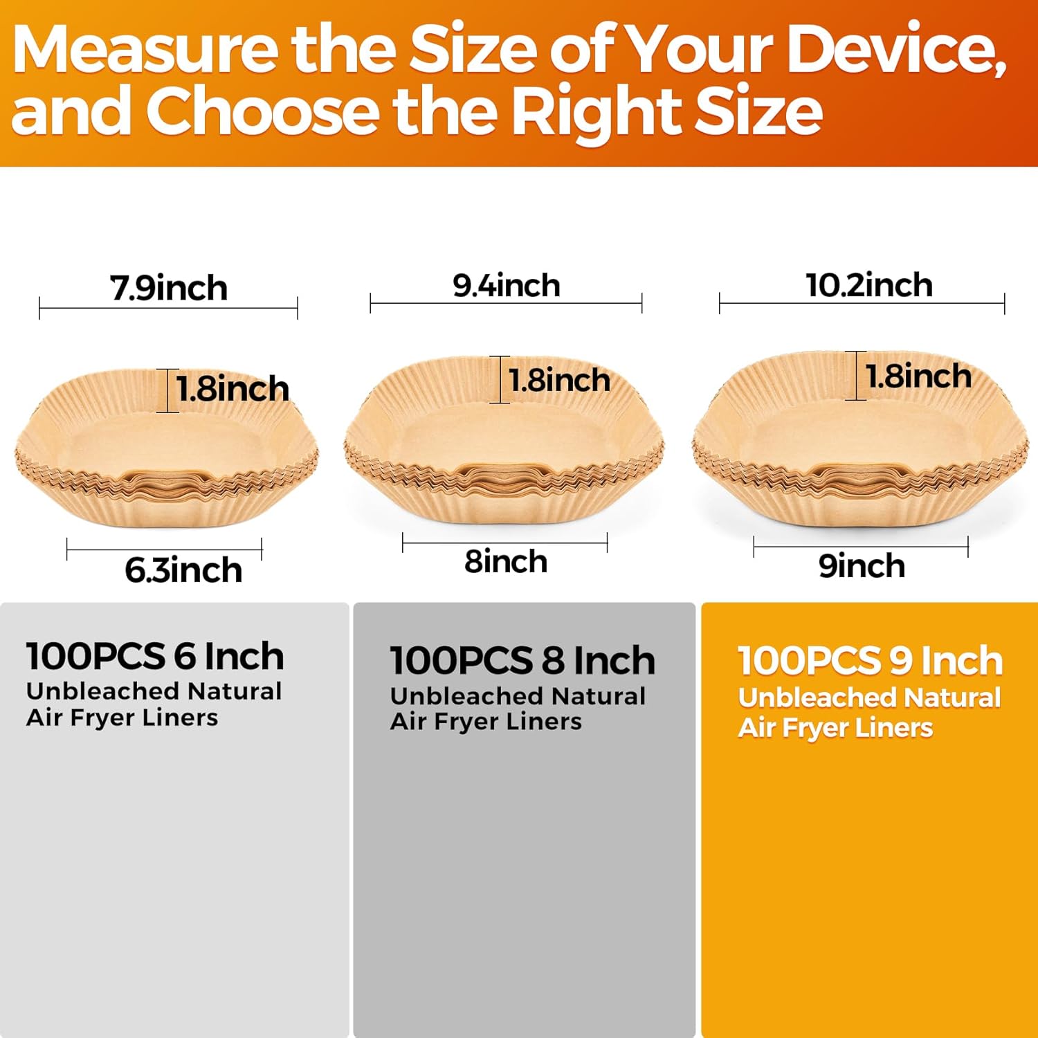 - Liners Size: Vailnd air fryer paper liners are in 9 inches at bottom diameter, suitable for both 8qt/10qt/11qt/12qt or larger round and square baskets. Heat resistant temperatures up to 428 fahrenheit
