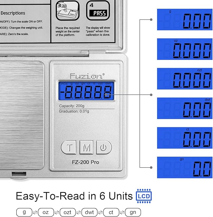 - Multiple Modes Display: Pocket Scale 6 Units of Measurement: Grams, Ounces, Grains, Troy Ounces, Pennyweights, Carats. Back-lit LCD Display, Ultra Fast Reading.