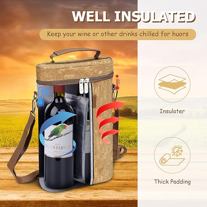 - LEAKPROOF & INSULATED-The leakproof lining ensures no spills, and the thermal insulation keeps your wine chilled for hours. With PU insulation and 5mm PE foam padding, this wine bottle carrier protects two bottles from external impact, making it an ideal grab bag gift for adults or white elephant gift.