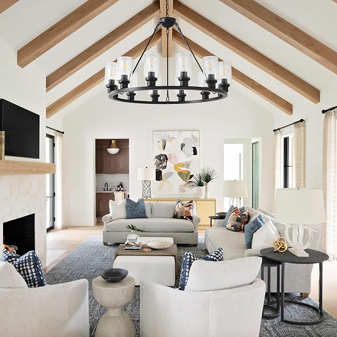 32“ Black Wagon Wheel Chandelier, 12-Light Farmhouse Glass Pendant Lights Kitchen Island Round Hanging Lighting fixtures Ceiling for Living Room, Dining Room, Kitchen Island, Entryway, Foyer