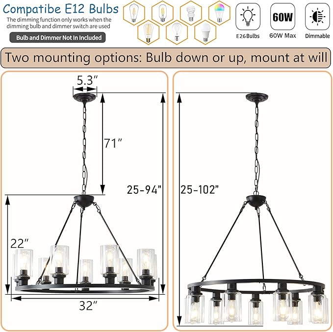 - 【BULB TYPE AND DIMMABLE 】 farmhouse pendant light requires 9 E26 base bulbs (bulbs not included), fully dimmable when using dimmable bulbs and compatible dimmer switch (switch not included).