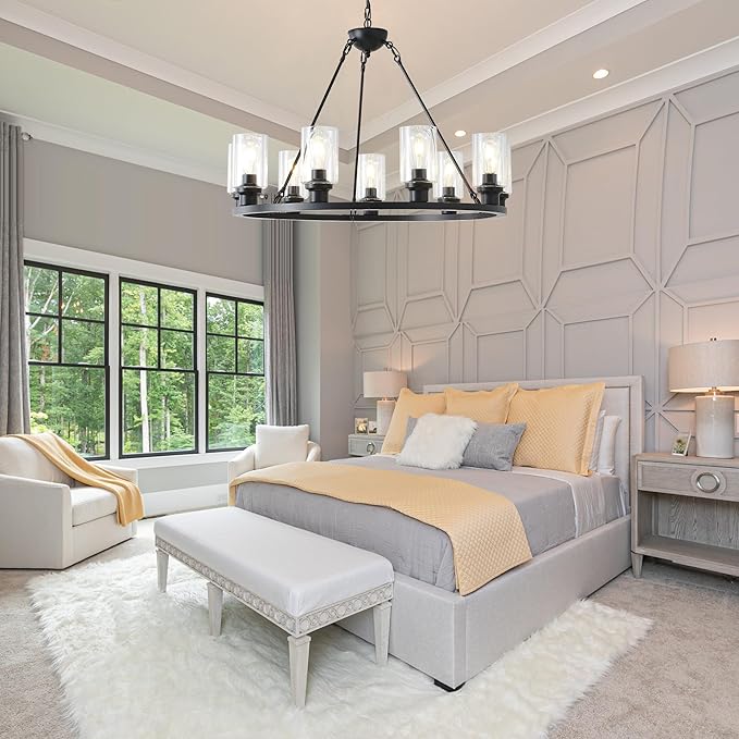 32“ Black Wagon Wheel Chandelier, 9-Light Farmhouse Glass Pendant Lights Kitchen Island Round Hanging Lighting fixtures Ceiling for Living Room, Dining Room, Kitchen Island, Entryway, Foyer
