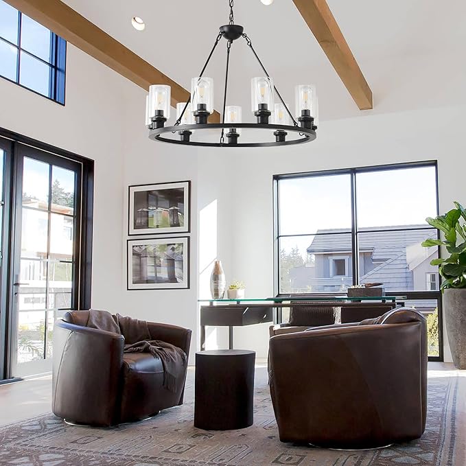 - 【farmhouse lighting fixtures ceiling】This 9-Light Wagon Wheel Pendant with Clear Cylindrical Glass Shade exudes a rustic vintage vibe. Offering 360° of light coverage.