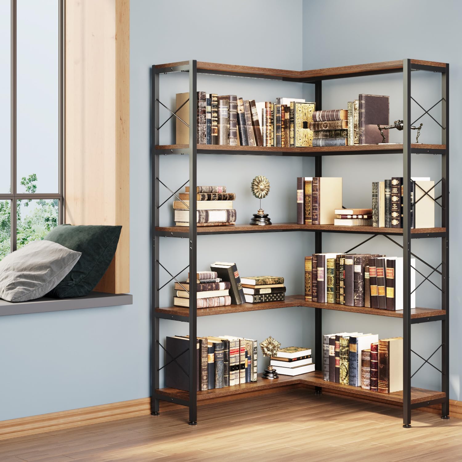 - â ăSOPHISTICATED MEETS PRACTICALăTogether with the rustic brown wood and matte black steel frame, this sleekly-designed, warm-toned corner bookcase gives your home or office a touch of industrial charm while keeping your space free of clutter. Fill the book shelf with eye-catching knick-knacks, and it will definitely become a centerpiece of your home.