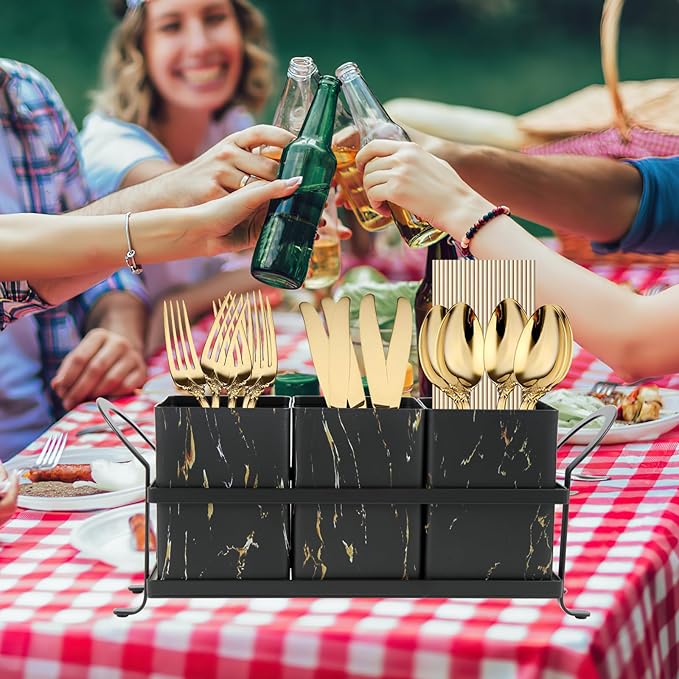 - 【The Perfect Gift】 With a Morden Gold and black marble look and functional design, our outdoor picnic or buffet caddy can be great gifts forliterally anyone and any occasion. Offer it to your loved ones for Housewarming Parties,Birthdays, Mother’s Day , Christmas or any other special day . Your friends and loved ones are sure to be impressed by this kitchen cutlery caddy.