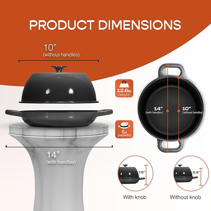- ULTIMATE DUTCH OVEN SET: Krustic enameled cast iron Dutch oven brings a game-changing innovation to your kitchen! Measuring 14" in diameter with handles, 10" without handles, 7.8" high with the knob, and 6.8" without the knob and weighing 12.6 lbs, this 6 quart pot with lid is a perfect size to create your culinary masterpiece. Our bread oven includes a non-stick, easy-to-clean, dishwasher-safe silicone mat sized 21.4" x 8.2", a care manual, and a homemade recipes book.
