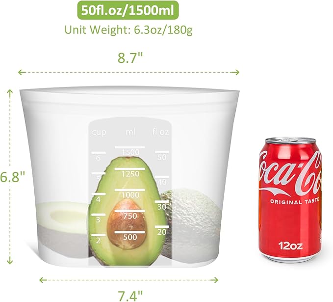 - 【THOUGHTFUL & ECONOMICAL】Medium size: 1.5quart/50.7fl.oz/1500ml. This reusable zip bag for food clearly marked measurements in cups, ml, and fl oz for easy use. Translucent body offers a glimpse inside. Robust construction ensures strength. One silicone bag can replace 300+ single-use plastic bags, saving money and creating a waste-free world