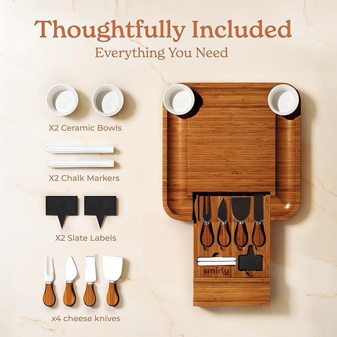 - Stylish Housewarming Gift - SMIRLY’s unique cheese board set is the perfect gift for couples, new homeowners, or apartment dwellers. With a decorative box and useful accessories, it’s a thoughtful and timeless present.