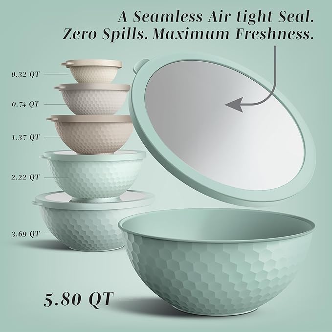 - Set includes 6 plastic bowls and 6 TPR lids; Bowl capacity of 0.32 QT, 0.74 QT, 1.37 QT, 3.69 QT and 5.8 QT.