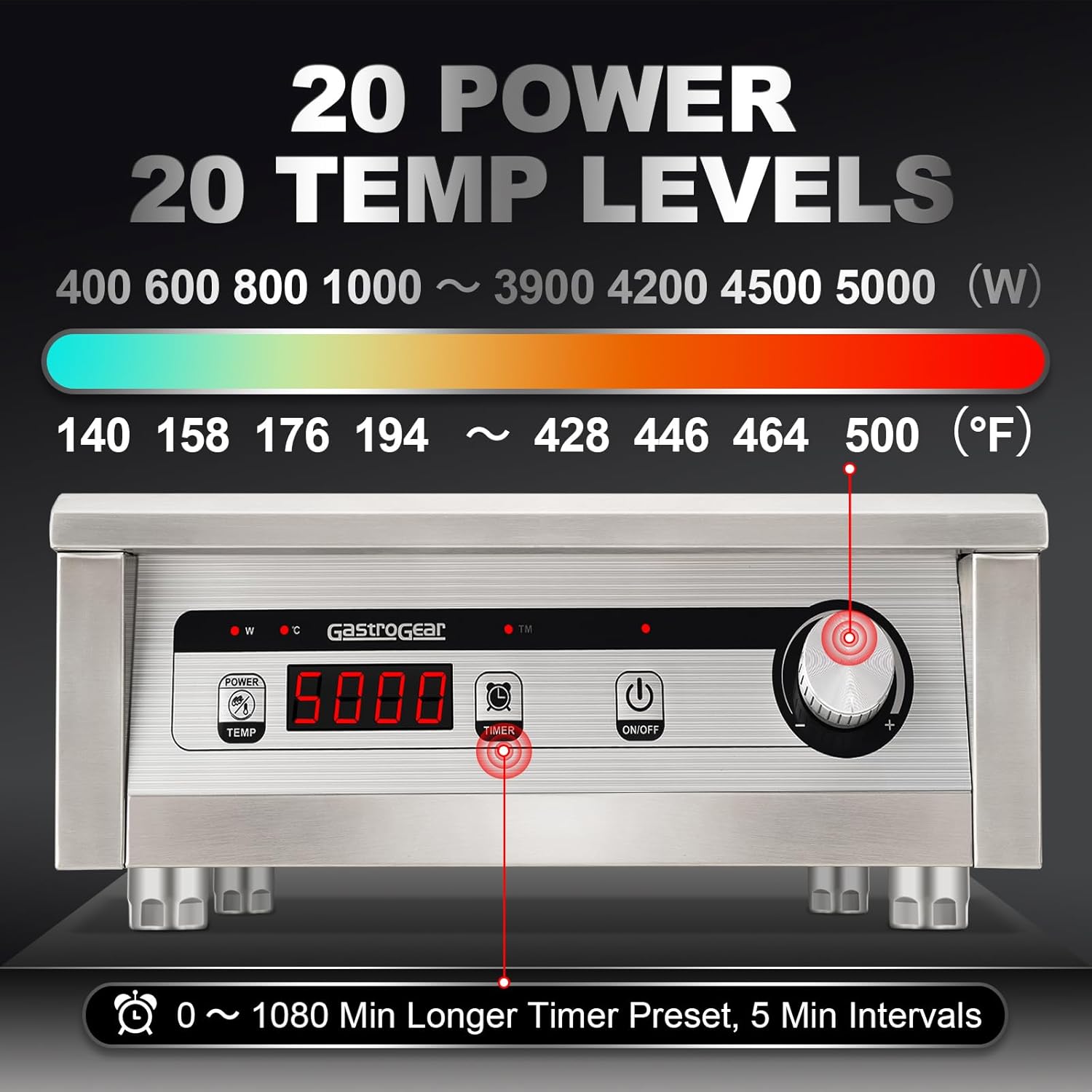 - 20 Preset Temp & Power Level: With 20 preset power (400W-5000W) and temperature levels (140°F-500°F), GastroGear's induction burner makes cooking precise and effortless. Save on energy costs and increase your cooking efficiency—triple the performance of gas or electric stoves. Enjoying the convenience of pre-programmed settings for a variety of dishes