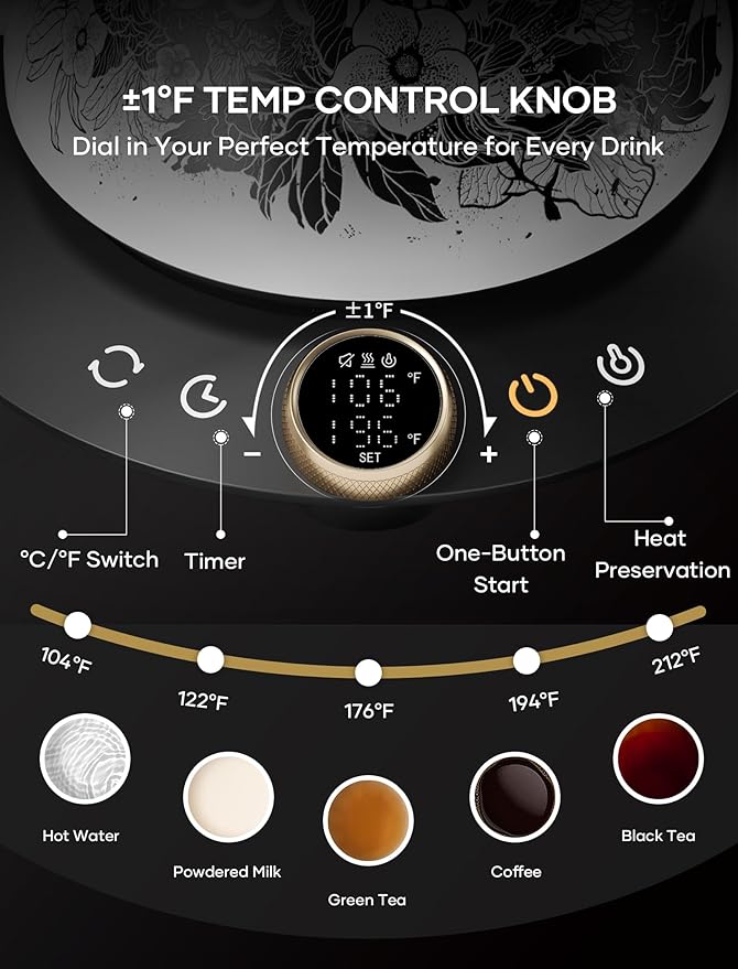 - ±1℉ Precision Control: Smart base with pro-grade sensor keeps water within ±1℉, delivering barista-level accuracy for coffee or tea.