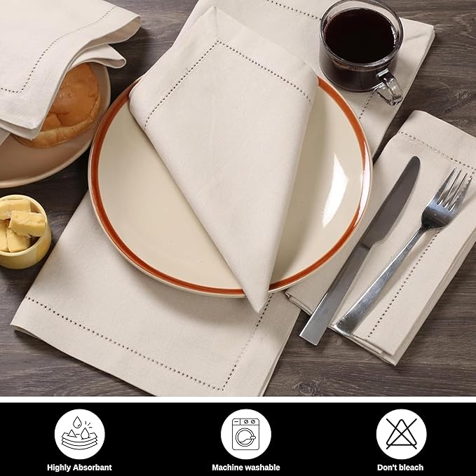 Bedding Craft Cotton Linen Cloth Dinner Napkins Set of 12 – 18x18 Flax Oatmeal Hemstitched – Machine Washable Reusable Fabric Napkins for Weddings, Parties & Events