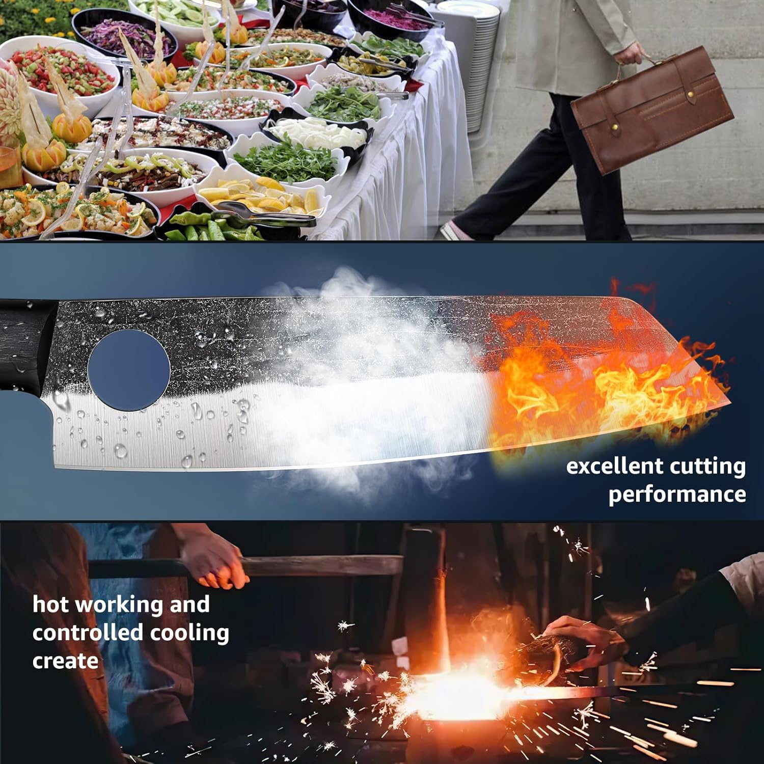 - High Carbon Forged Knife Set: This chef's knife set features blades constructed from an enhanced version of hand-forged high carbon steel. Meticulously hand-hammered to create a distinctive hammered texture, the blades exhibit heightened hardness and toughness. With their precisely honed 16°V-shape sharpening, these blades minimize cutting resistance, while the meticulously hand-ground open edges ensure exceptional sharpness, enabling effortless and precise slicing of food.