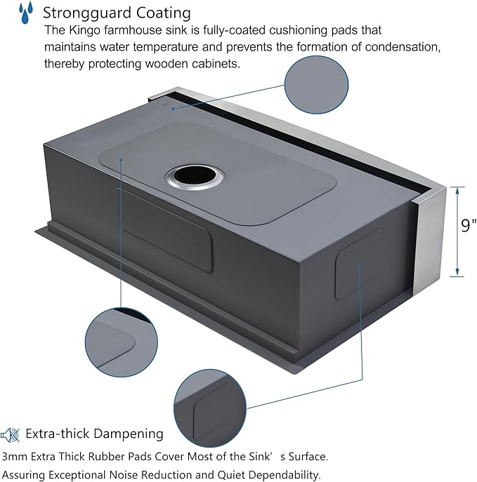 - Under the apron front sink ,Thick 3 mm rubber damper pad tone Guard Undercoating ,padded on all sides for superior noise reduction to keep your sink quieter,thus lowering the sound level. Anti-condensation thickening noise reduction coating absorb sound from the source and isolate condensate.