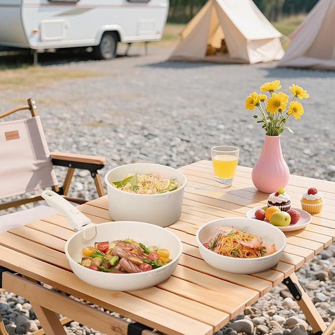 JEETEE Nonstick Pots and Pans Set with Removable/Detackable Handle (Beige, 25 Pieces)