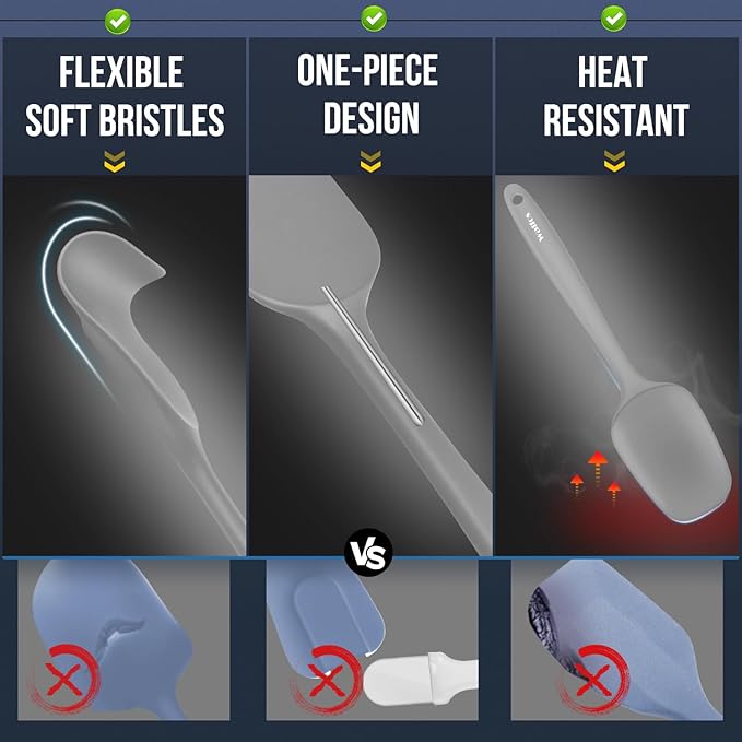 - 【One-Piece Design】 One-Piece Design make sure that your silicone spatulas won't trap food particles, so the spatulas can be clean up easily and can keep your food safe. Ergonomic handle is very easy to grip ! Each spatula has a perfect angle and a soft silicone surface, which is very easy to scrape the food in the bowl.