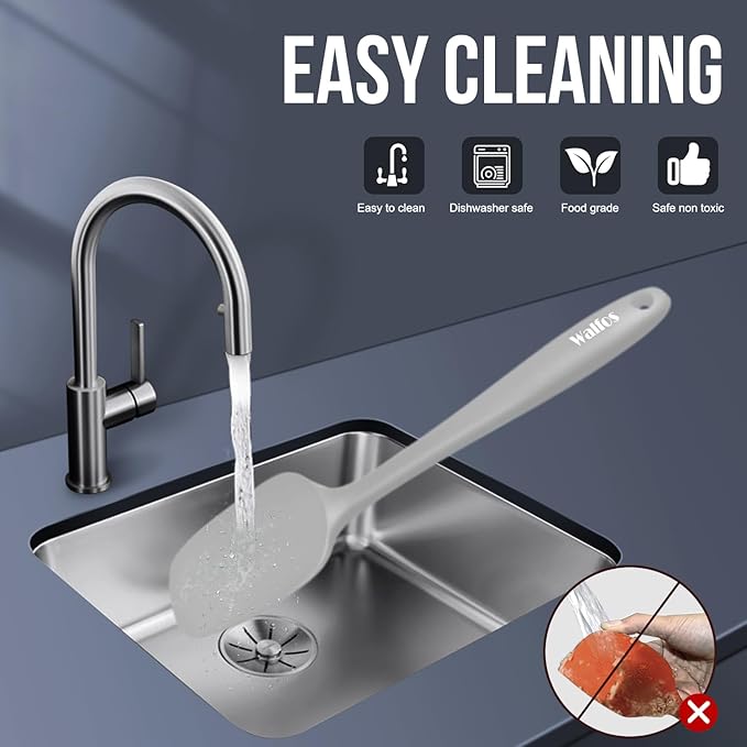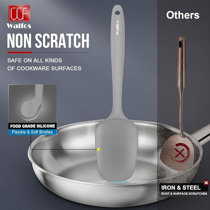- 【Food Grade Silicone】 WALFOS spatulas are made of premium food grade silicone. High heat resistant up to 600°F. 7pcs non-stick silicone spatulas in different sizes and different shapes are great helpful in cooking, baking, decorating, mixing, ect. BPA Free, safe for your health and easy on all of your cookware.