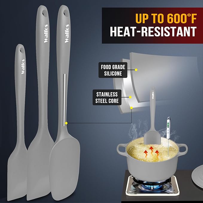 Walfos Silicone Spatula Set (7pcs) - 600℉ Heat Resistant Silicone Scraper Spatulas with Stainless Steel Core, Non Stick Flexible Rubber Spatula for Cooking, Baking and Mixing, Gray