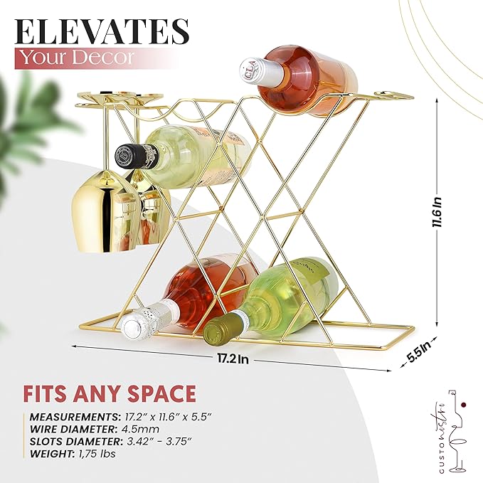 - EXCEPTIONAL QUALITY, built to age the finest wines. Our modern gold wine rack and wine glass holder stand is made of iron with a beautiful, yet durable electroplated finish. Each geometric wine rack is the definition of “elegant”