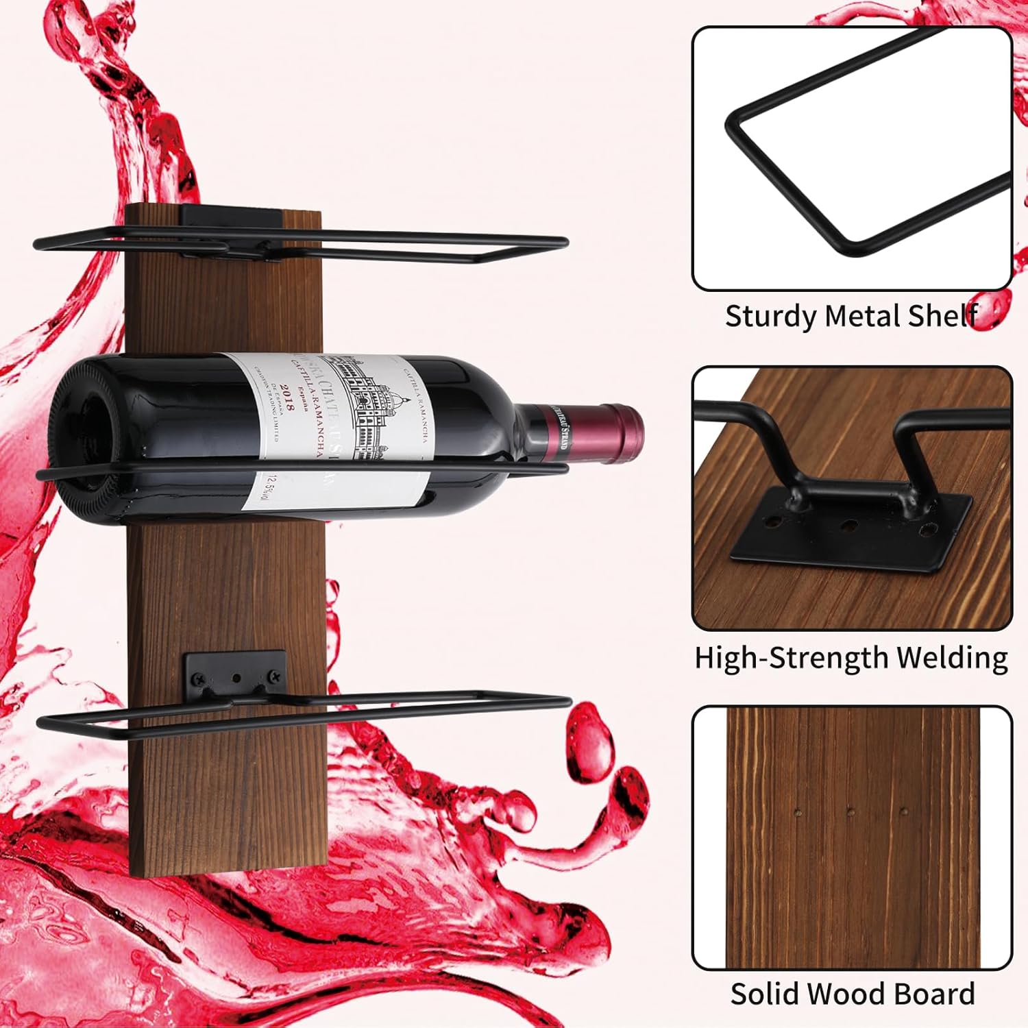 - Wine Rack Wall Mounted - It accommodates standard 750ml round wine bottles with a diameter greater than 2.75” and comes with easy-to-follow instructions for quick assembly and mounting. Supports up to 9 round wine bottles.
