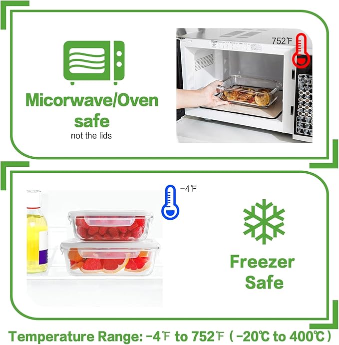 - [Microwave/Oven & Freezer Safe] Our containers can withstand temperatures from -4℉ to 752℉, you can use them in oven/microwave(Not the lids) and freezer storage. High quality borosilicate glass is more durable, allowing you to use the containers within the permitted temperature range without worrying about the box breaking. Please not put the lids in microwave/oven to avoid deformation of the lid and silicone strip