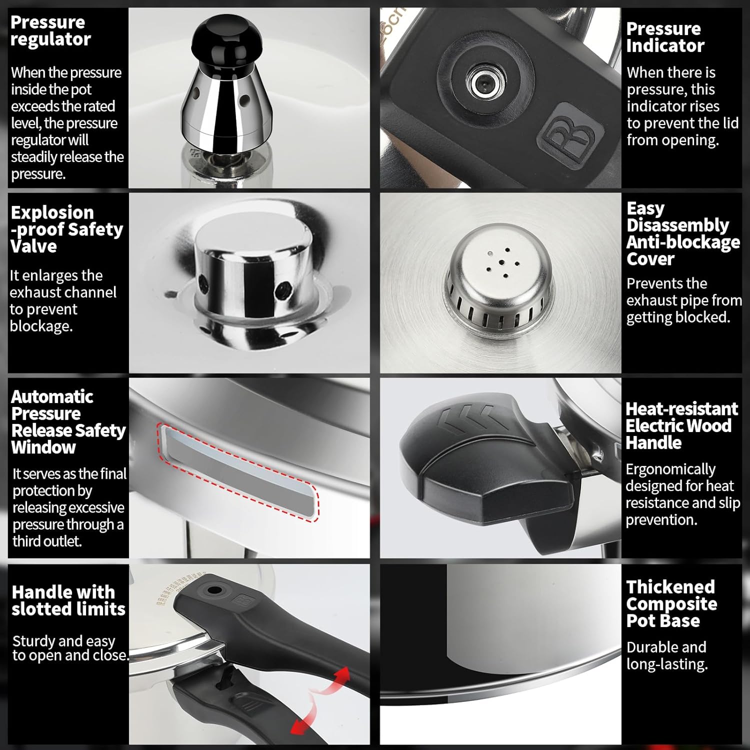 - ā [Multiple safeguard devices]-The induction pressure cooker equipped with multiple safety devices such as pressure indicator, pressure regulator and emergency release valve. The pressure indicator will according to the pressure to rise and fall to lock the lid, and the pressure regulator automatically maintains cooking pressure. When the pressure inside the cooker exceeds safety limit, the emergency release valve can automatically relief the pressure ensure safe use. This kind of design is a revolution in traditional pressure cooker technology.