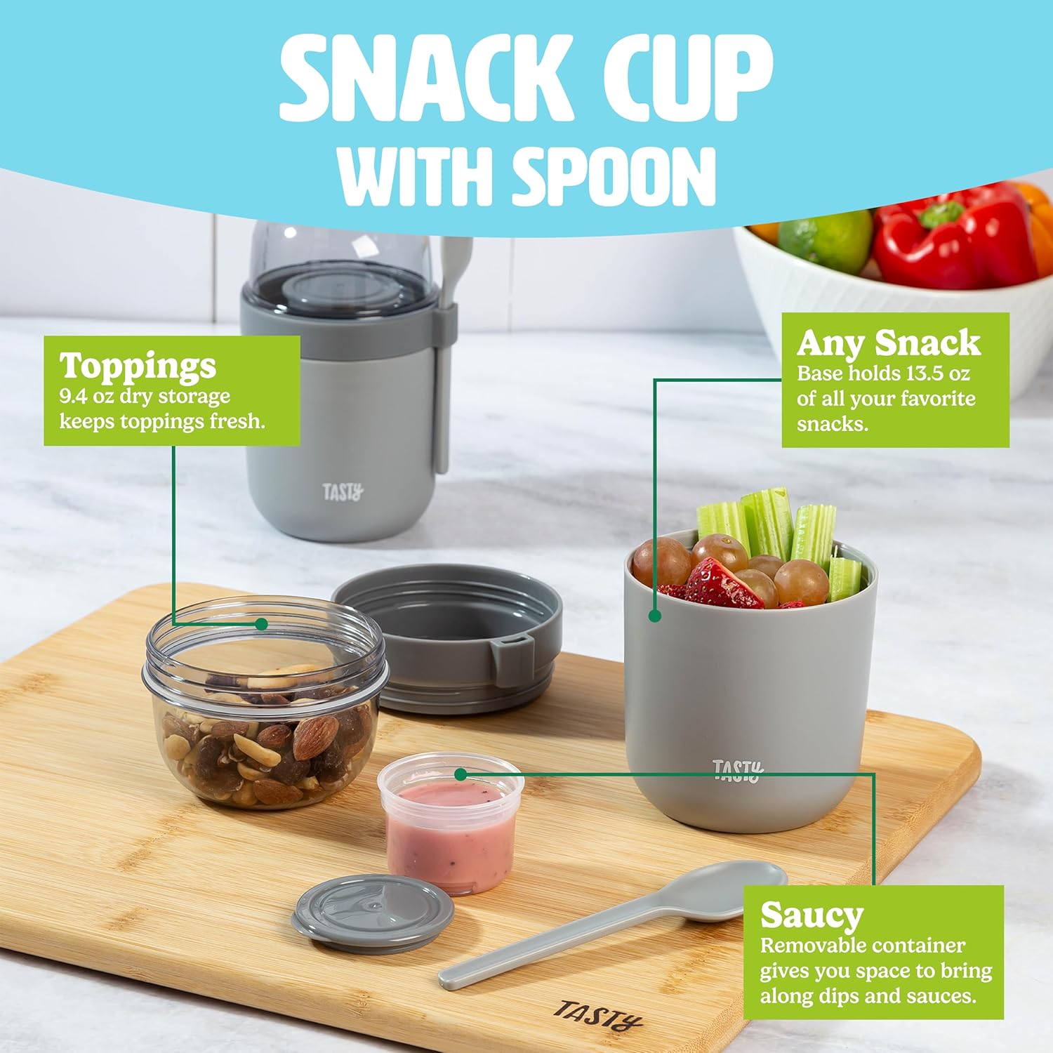 Tasty Travel Snack Cups with Spoons, On-The-Go Snacking, Divided Compartments, Great for Nuts, Cereal, Granola, Yogurt and More, Made Without BPA, 2-Pack, Gray