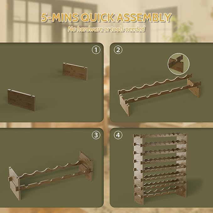 - šš®šš šššš²šŗšÆš¹š: Each shelf of this modular stackable wine rack features deep grooves and the partitions are tightly fastened to each other without loosening; No tools required, Simple follow the assembly instructions to combine the partitions in order, and you'll have an elegant wooden wine rack in about 5 minutes (Please make sure whether the parts are positioned correctly before assembly); If you need to move the wine rack, please be sure to remove the wine bottles first