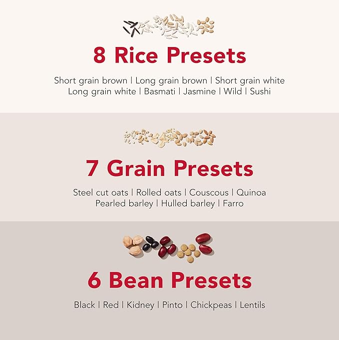 - Explore a whole new world of whole grains with 21 preset options for rice, beans, oats, couscous, quinoa, barley, farro and more