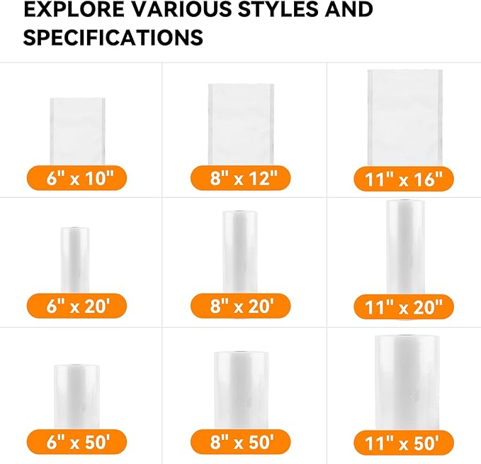 - VERSATILE COMPATIBILITY: 1 roll 6"x50', 1 roll 8"x50' and 1 roll 11"x50', 3 rolls in total, compatible with both chamber and external vacuum sealers, providing flexibility for various machines, such as Food Saver, Seal a meal, Nesco, Weston, Cabela’s, Ziploc etc.