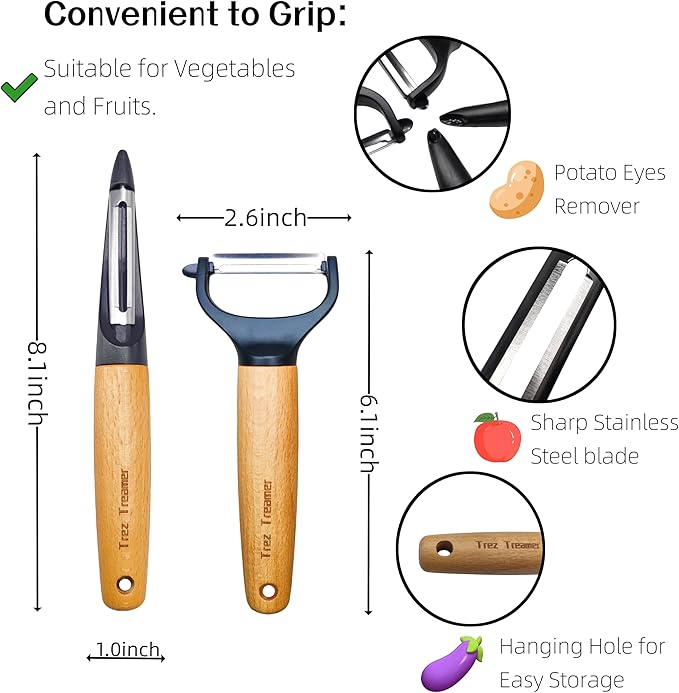 Trez Treamer 2 pack Vegetable Peelers for Kitchen, Super Sharp Wooden Potato Peeler Set Apple Cucumber Carrot Fruit Potatoes Veggie Peeler Bulk with Stainless Steel Blade,Dishwasher Safe